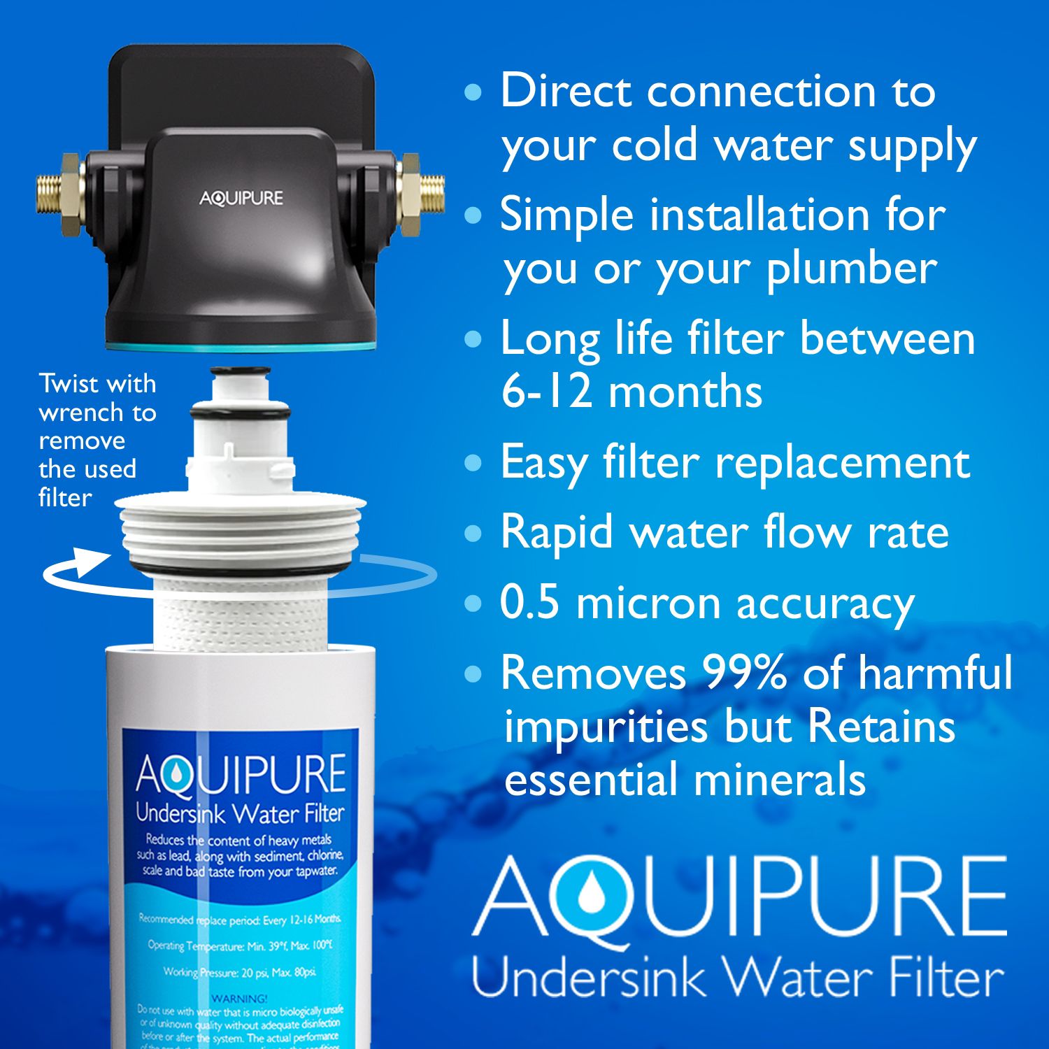 The Aquipure filter system is designed with a replaceable core cartridge, so you’ll only replace the filter core, not the entire housing. This saves money and reduces plastic waste. Each cartridge has a long-lasting capacity, providing up to 2 years of use; for optimal filtration, we suggest replacing it every 9-12 months.